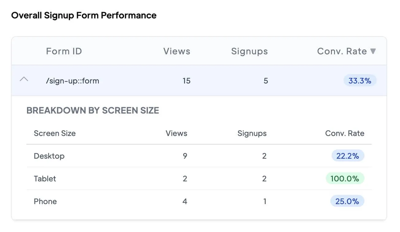 See views, signups, and conversion rates for every form. Break down performance by page, device type, and UTM parameters.